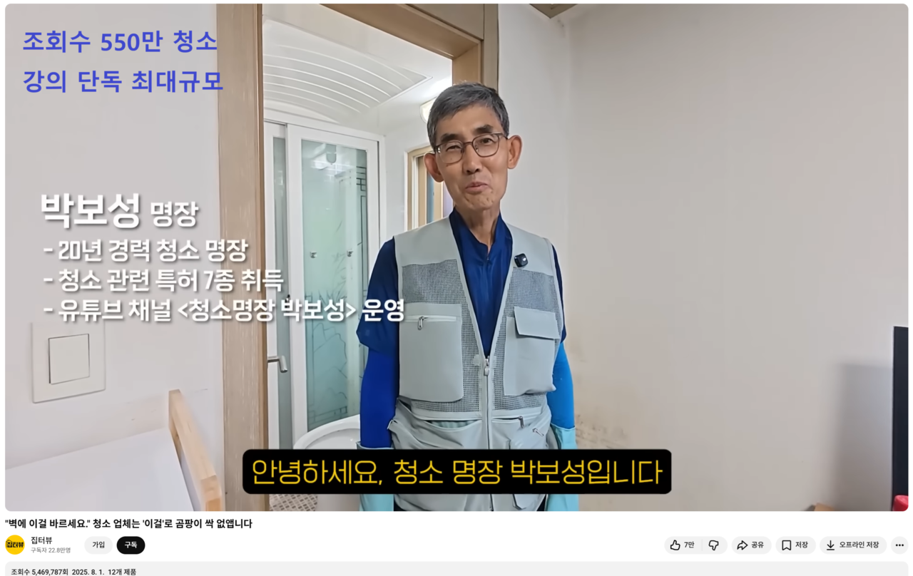 유튜브 기준 550만 조회수 1타 청소강사!